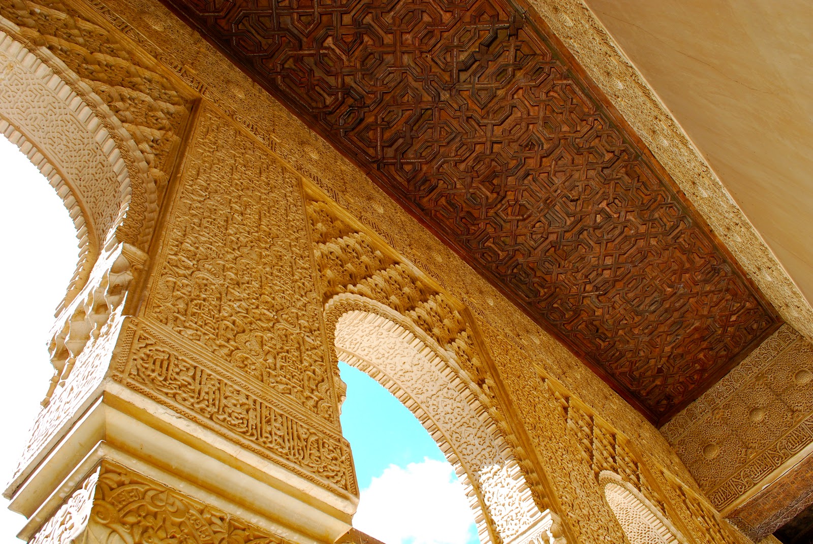 Although I had the audio guide to use at my disposal, I did not make much use of it as I was too busy and focused on taking photos. As I wandered from room to room, I was in total awe of the gorgeous and elaborately carved decorative wall art. Instead of painting on canvases or sculpting statues, Islamic artists created brightly colored ceramics, glazed tiles, carpets, and intricately carved ceilings. The attention to detail which was required of the carving is beyond anything I can possibly comprehend. Many of the patterns on the walls included gorgeous calligraphy in Arabic which had to have been incredibly difficult to carve. I was able to get so many beautiful shots of both the interior and exterior of the palace, including some great reflection shots of the palace in the pool; I was very pleased and happy!